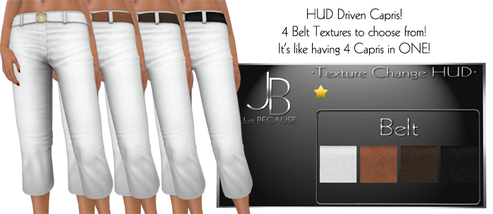COMING SOON! (After some cute mesh tops are made to make a collection, of course!) Mesh Belted Capris! This shows them in world, untextured. Pretty darn cute, wouldn't you say?? :D I can't wait to get started on the mesh shirts!
